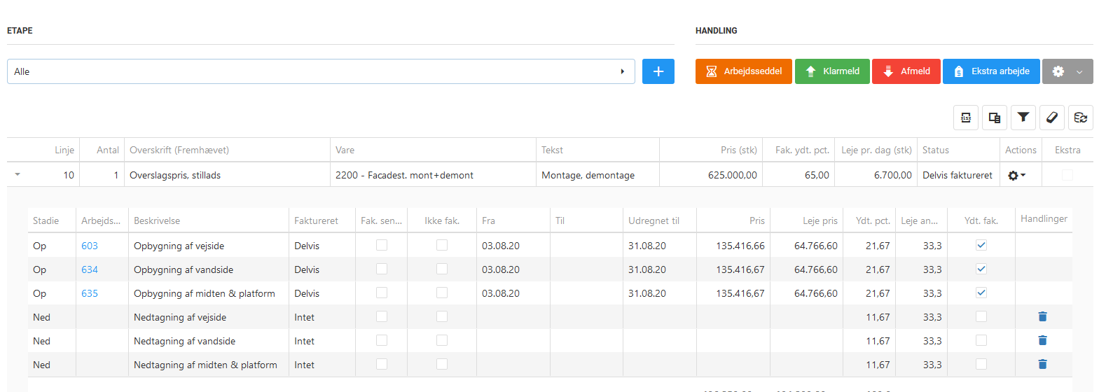 Klarmeld & afmeld med split opkrævning for montage & leje ved opdeling af etapen.